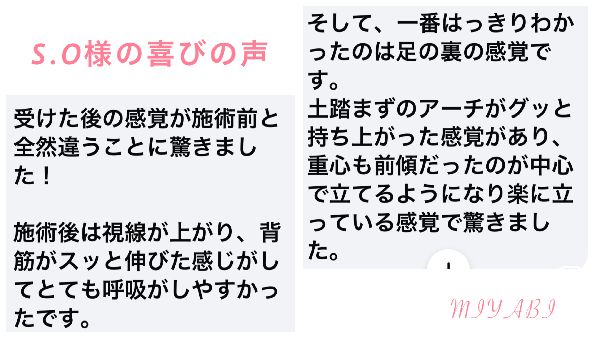 土踏まずのアーチがグッと持ち上がった感覚があり、重心も前傾だったのが中心で立てるようになり楽に立っている感覚で驚きました。